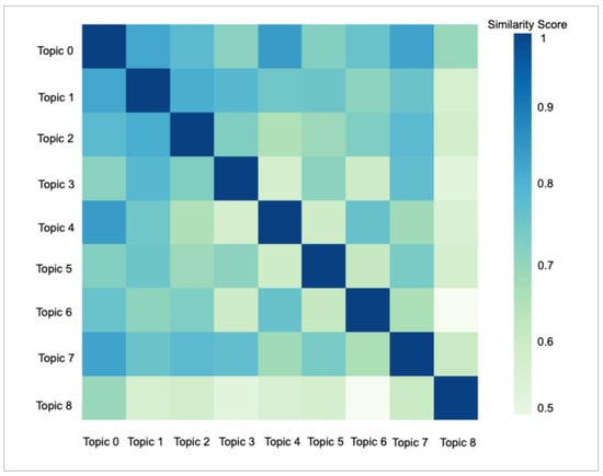 The analysis generated a similarity matrix illustrating similarity scores between topics identified by BERTopic modeling within the SOC and RS study corpus. Scores range from 0.5, indicating lower similarity, to 1.0, denoting high similarity or near-identical topics. The color gradation from light to dark blue corresponds to increasing similarity scores. Specifically, the matrix reveals a moderate similarity between Topic 0 (spectral prediction models for soil organic carbon) and Topic 1 (global carbon cycle observation via RS). In contrast, Topic 2 (RS of wetland organic carbon reserves) distinctly differs from Topic 4 (agricultural production and soil carbon) (Figure 3). Furthermore, a higher degree of similarity is observed between Topic 5 (post-fire soil organic carbon dynamics) and Topic 6 (soil carbon conservation in rice fields). Conversely, Topic 7 (peatland soil carbon monitoring) and Topic 8 (identification of soil contamination) exhibit lower similarity scores when compared to the rest of the topics (Figure 4).