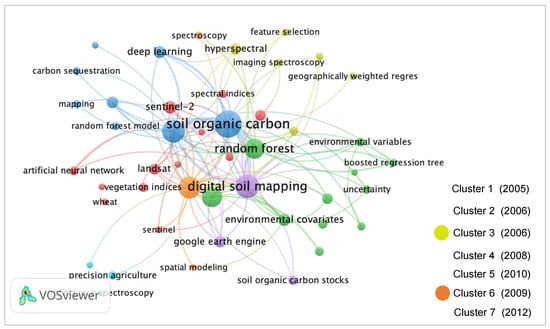 Keyword co-occurrence analysis produces seven thematic clusters. The first cluster demonstrates the relationship between soil carbon and climate change, utilizing RS techniques with keywords like “carbon sequestration” and “climate change”, emphasizing soil’s crucial role in climate dynamics. The second cluster explores RS technology in land use, featuring advanced monitoring technologies such as “artificial neural network” and “Landsat”. The third cluster focuses on soil properties and spectral techniques, analyzing soil composition through keywords like “hyperspectral” and “imaging spectroscopy”. The fourth cluster emphasizes data analysis and the scrutiny of environmental variables, incorporating terms like “hyperspectral remote sensing” and “random forest”, indicating a focus on data-driven environmental research. The fifth cluster centers on digital soil mapping and geospatial information, highlighting the use of “digital soil mapping” and “Google Earth Engine” for detailed soil mapping. The sixth cluster characterizes the application of spectral techniques and data analysis in soil research, with “spectroscopy” and “spatial modeling” denoting a reliance on spectral data. Lastly, the seventh cluster focuses on precision agriculture, underlining the importance of technology in enhancing agricultural productivity and sustainability through keywords like “precision agriculture” and “reflectance spectroscopy”. These clusters create a cohesive framework of research themes, detailed in the following sections, illustrating the complex interactions between soil science and RS applications (Figure 5).