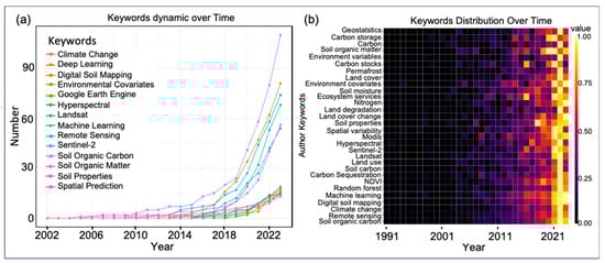 The dynamic evolution of soil science research is evident in the shifting patterns of keywords over time (Figure 6a). The keyword “soil organic carbon” has exhibited a notable increase in publications, from only 1 article in 2006 to 110 articles in 2023. This trend surpasses a mere reflection of the overall growth in soil science publications: the study of “digital soil mapping” gained momentum after 2014, reaching 81 articles in 2023, indicating a notable increase in research focus on digital soil mapping and related topics. “Remote sensing” is another keyword that has garnered attention, showing a steady rise since 2006 and culminating in 74 articles by 2023. Moreover, the integration of advanced technologies like “machine learning” and “deep learning” into soil science research, evidenced by the increasing number of articles, showcases the field’s adaptation to cutting-edge methods with which to address complex issues more effectively. Keywords like “random forest”, “Sentinel-2”, and “hyperspectral” further underscore the varied technological approaches enhancing contemporary soil science research (Figure 6a).