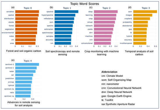 The BERTopic model applied to SOC prediction studies involving RS and ML has distinguished five primary topics. Topic 0 addresses spatial analysis in forestry for SOC stock assessment, employing variables such as forest density and area measurements. Topic 1 explores soil analysis using spectral data, emphasizing the significance of hyperspectral imaging for precise SOC quantification. In Topic 2, the focus shifts to the integration of deep learning with agricultural datasets, highlighting the role of advanced ML in understanding crop-related SOC dynamics. Topic 3 underscores the use of multitemporal imaging for tracking temporal variations in SOC, indicating a trend towards longitudinal studies on cropland management. Lastly, Topic 4 emphasizes the adoption of advanced RS platforms like Sentinel-2 and SAR for enhanced SOC prediction, demonstrating the field’s progression towards sophisticated observational technologies (Figure 7).