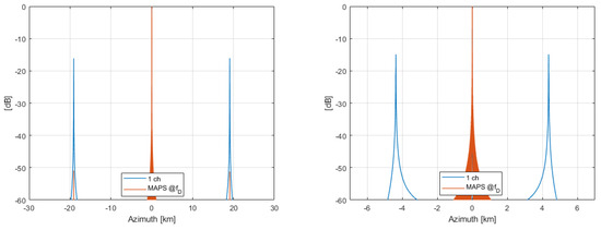 Since the uniform PRF was different in the two configurations, a choice was made for the actual PRF, to obtain two systems comparable for the ambiguity rejection. For the non-Ov-MAPS, in the case of acquisition at the ideal PRF, the ambiguity suppression was very weak since the AzPTAR amounted to −21.44 dB while the AzDTAR amounted to −14.18 dB. For this reason, the PRF of the first system was doubled with respect to the ideal value.