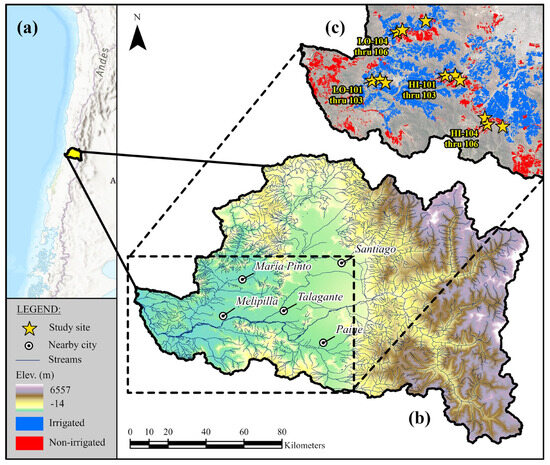 Our study focused on the Maipo River Basin located in Central Chile (Figure 1a). Per its regulatory delineation, the basin collects water from over 15,200 sq km, from the Andes Mountains to the Pacific Ocean [38]. It encompasses the Región Metropolitana de Santiago, Chile’s most densely populated region. It also extends over parts of the Región de Valparaíso (to the west) and Región del Libertador General Bernardo O’Higgins (to the south). We combined the most recent land registry information available from the three administrative regions studied to build a comprehensive inventory of all the 180,000 hectares of agricultural fields in the basin [39,40,41].