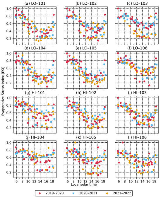 We aligned each ECOSTRESS snapshot on a 0.0006° grid (i.e., ~70 m spacing), encompassing approximately 4.1 M pixels over the study area (EPSG 32719). We compiled a total of 316 observations taken at various acquisition time over 242 days, spanning from 21 July 2018 to 19 January 2023 (Figure S1). Due to its irregular orbit aboard the ISS, ECOSTRESS returns to a given location at various times of day with inconsistent intervals. Each ESI value represents an instantaneous measure at the time of ECOSTRESS overpass [56]. We converted the Coordinated Universal Time (UTC) reported for each observation to the local solar time. To account for the potential variations between the different revisit times, we differentiated ECOSTRESS overpasses based on the following time periods: