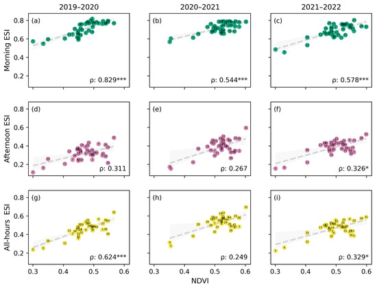 Trends in Evaporative Stress Index (ESI) from ECOSTRESS (y-axis) against Normalized Difference Vegetation Index (NDVI) from Landsat 8 (x-axis) of agricultural areas with different water allocations in the Maipo River Basin across various times of day (vertically) and growing seasons (horizontally). The positive correlation between the two variables is illustrated by a regression line (dashed) and its 95% confidence interval (shaded). Spearman’s ρ coefficient is shown as a measure of the monotonic association between two variables. Significance levels are indicated based on the thresholds of p < 0.05 (*), p < 0.01 (**), and p < 0.001 (***).