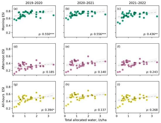 Trends in Evaporative Stress Index (ESI) from ECOSTRESS (y-axis) against total allocated water (x-axis) of agricultural areas with different water allocations in the Maipo River Basin across various times of day (vertically) and growing seasons (horizontally). The positive correlation between the two variables is illustrated by a regression line (dashed) and its 95% confidence interval (shaded). Spearman’s ρ coefficient is shown as a measure of the monotonic association between two variables. Significance levels are indicated based on the thresholds of p < 0.05 (*), p < 0.01 (**), and p < 0.001 (***).