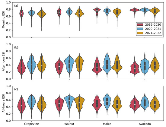 When further examining the distribution of ESI, we found that it also varied across irrigated parcels based on crop types (Figure 6). The dispersion of ESI for each crop type is substantially larger for the afternoon and all hours combined, than it is in the morning time. Focusing on morning ESI only, we also observed that the stress imposed on avocado parcels is generally lower (i.e., higher ESI) than it is for grapevines (Figure 6a). Going further, morning ESI also appeared to shift down (i.e., further exacerbated) in the growing cycle 2021–2022 in comparison to the prior year (i.e., on average −5.0% for grapevine, −5.1% for walnut, −3.8% for maize, −3.9% for avocado).