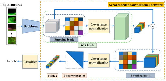 This section exhibits the workflow of the proposed LRCAISS. As shown in Figure 1, auroral images are input into the backbone to extract low-level features. And then a second-order convolutional network exploits the second-order statistics from the extracted low-level features, which outputs discriminative tensor features. Finally, two MLP layers are used as classifiers. The second-order convolutional network contains an encoding block, a second-order channel attention (SCA) block, and operations for leveraging the discriminative ability of extracted features. Each part of LRCAISS is detailed below.