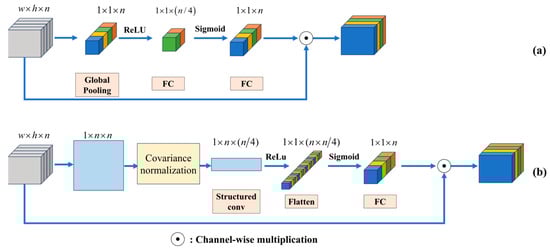 Figure 2a depicts the framework of the SE block which is a classic structure, and existing channel attention methods are adapted on this foundation. The SE block contains global pooling and two FC layers with ReLU and Sigmoid activation functions. ReLU and Sigmoid are used to provide non-linearity; furthermore, Sigmoid is inserted at the end of channel attention block to map the attention values between 0 and 1.