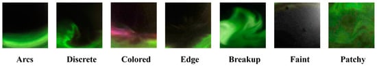 Two public auroral image datasets are utilized to evaluate the proposed methods. In this paper, the names of all auroral categories are italicized to make the expression clear. Dataset 1 [15] was collected by the all-sky camera from 2010 to 2019, deployed at Kiruna, Sweden. The latitude and longitude location of the camera is 67.84°N, 20.42°E. This all-sky camera archives images in JPEG with a resolution of pixels. All images were preprocessed by rotation, filtering, and cropping, resulting in a resolution of pixels. The images were then manually labeled, and finally, 3864 images were selected from 14,030 images to constitute Dataset 1. Seven categories are involved, including breakup, colored, arcs, discrete, patchy, edge, and faint. The representative samples from each category are displayed in Figure 3, and the sample distribution of different types is listed in Table 2.