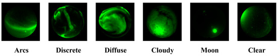 Dataset 2 [17] originates from the Time History of Events and Macroscale Interactions during Substorms (THEMIS) all-sky imagers system [46], which contains 5824 images with the resolution of pixels. Their classification criterion is adapted from [47], which divides the images into four classes: no aurora, arcs, patchy aurora, and omega-band. Novock et al. [17] use similar types, namely diffuse as patchy and discrete as omega-band aurora, and classify no aurora into three subclasses: cloudy, moon, and clear. The examples of each class are exhibited in Figure 4, and the sample distribution is provided in Table 3.