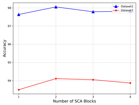 The SCA block can be cascaded multiple times to comprehensively capture channel attention information, and the optimal number of SCA blocks for aurora image classification is needed. Figure 5 illustrates how accuracy varies with the number of SCA blocks ranging from one to four. The trend in classification accuracy change is similar across both datasets. Specifically, the accuracy peaks when there are two SCA blocks. However, deviating from this optimal number, either increasing or decreasing the count, leads to diminished classification accuracy. Hence, LRCAISS is designed with two SCA blocks.