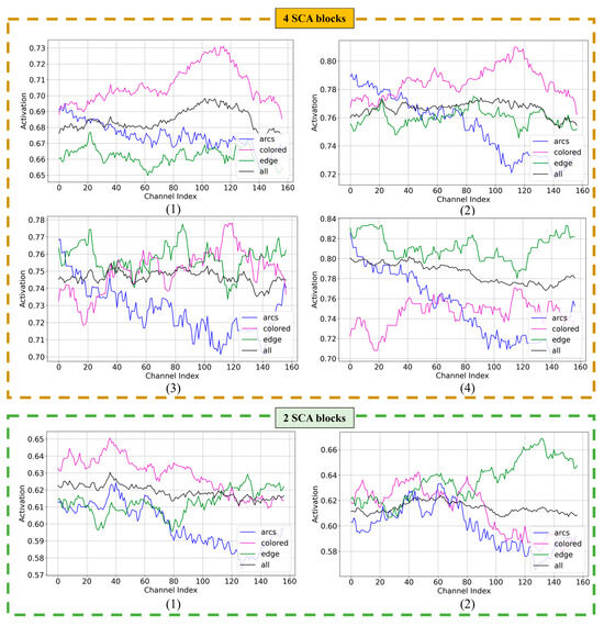 To further understand the second-order channel attention mechanism operating in LRCAISS, three classes of auroral images are sampled in Dataset 1, and the distribution of average channel attention activation is shown in Figure 6. And the distribution of average activation over all classes is provided for comparison. Directly drawing the activation of each channel would result in an irregular graph, so shift smoothing is applied to enhance its clarity, and the horizontal coordinate is less than 256, the number of channels. The number below each graph denotes the distribution output by the corresponding SCA block, and larger activation values mean the channel plays a more important role in classification. As for the LRCAISS with four SCA blocks, the activation distributions of each SCA block are provided in the upper part of Figure 6. From the first to the fourth block, the activation values become more class-specific. For LRCAISS with two SCA blocks, a consistent pattern is observed, which is that the variation in attentional values between channels increases progressively from the first to the second block. This suggests that the blocks help the network to better discern differences between classes. Furthermore, according to the results in Figure 5, two blocks achieved the best performance. This may be because two blocks are sufficient to learn the necessary differences, while more blocks led to overfitting and fewer blocks did not capture enough distinctions. This phenomenon also suggests that directly cascading the SCA block may not significantly enhance the network’s representational capacity.