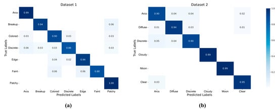 The difference between Dataset 1 and Dataset 2 is that the number of images in each category in Dataset 1 is not evenly distributed, which may cause the model to perform poorly in certain categories. The classification criteria of the two datasets are also not quite the same; Dataset 1 dispatches images without auroras and classifies aurora images into seven categories in a more detailed manner, with some unique categories added, such as taking into account the position of the aurora in the image and the color of the auroras by classifying them into edge and colored. On the other hand, Dataset 2 not only categorizes auroras but also subdivides the non-aurora images into three categories, which helps to determine the presence of auroras. Different categories have corresponding physical meanings, e.g., arcs represents a steady state of auroras [11], which is generated by the acceleration of quasi-static particles [48]. Discrete represents a mixed representation of multiple physical processes that generate auroras, and patchy consists of several pulsating structures [49]. Collisions between different energetic particles produce auroras of different colors, so colored is related to the altitude and excited atmosphere component. The detailed classification criteria of the two datasets are in [15,17].