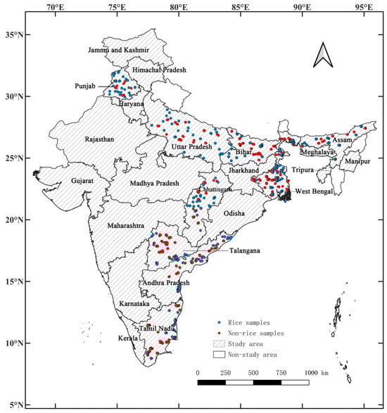 Study area, including the administrative regions of 23 states of India. Blue dots indicate rice survey sites obtained from Google Earth and red dots indicate non-rice survey sites obtained from Google Earth.