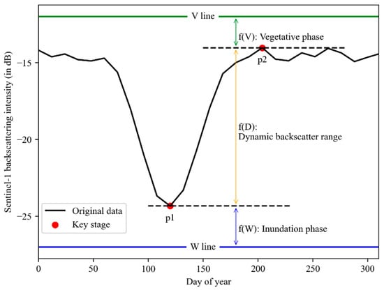 We calculated the annual composite maximum of the backscattering intensities for each pixel in the vegetated region, arranged them in order from largest to smallest, and selected the value of the backscattering coefficient on the decile as the value of the V-line. We also calculated the annual composite minimum of the backscattering intensity for each pixel on the water body region, sorted the values from smallest to largest, and selected the value of the backscattering coefficient on the decile as the value of the W line [41].
