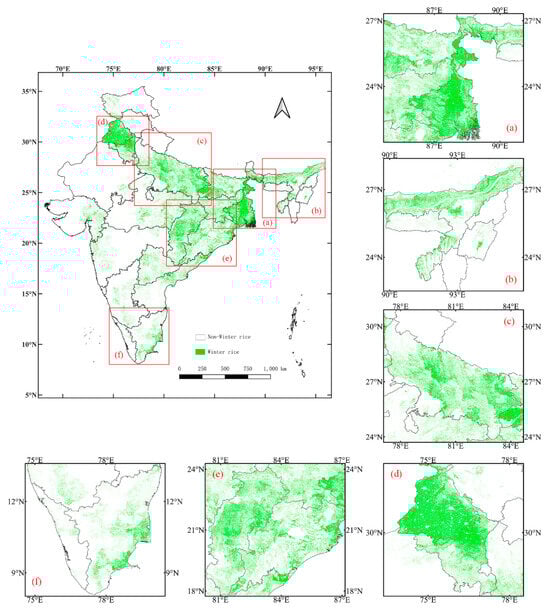 Winter rice identification map of India in 2020. Panels (a–f) on the right and bottom are enlarged maps of the winter rice states.