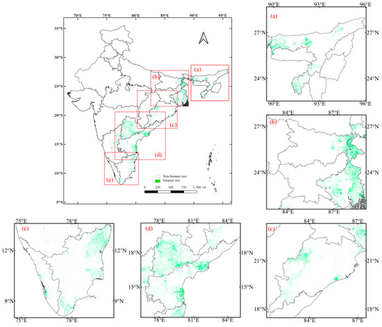 Summer rice identification map of India in 2018. Panels (a–e) on the right and bottom are enlarged maps of the summer rice states.