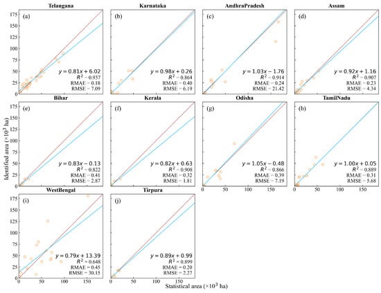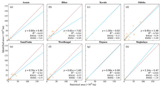 For autumn rice in all states, the comparison of the identification results with district-level statistical data demonstrated good performance. The slopes ranged from 0.76 to 1.14, the R2 from 0.64 to 0.99, the RMSE from 0.81 to 14.89(103 ha), and the RMAE ranged from 0.13 to 0.49. (Figure 9). High accuracies were found in Tripura, Meghalaya, and Meghalaya in the northern region of India and Kerala in southern India, with the R2 ranging from 0.92 to 0.99, RMAE from 0.13 to 0.26, and RMSE from 0.81 to 1.34 (103 ha), which may be due to the more intensive autumn rice cultivation in these regions.