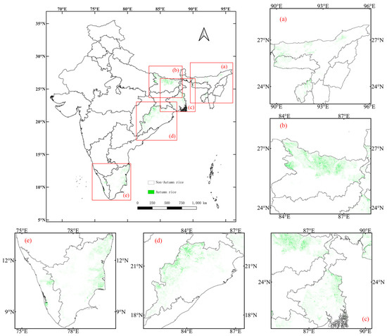 Autumn rice identification map of India in 2018. Panels (a–e) on the right and bottom are enlarged maps of the autumn rice states.