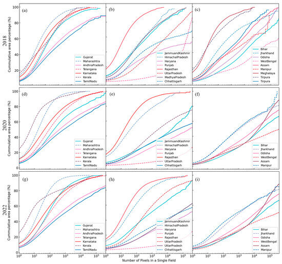 Cumulative distribution of patches with varying pixel numbers in the 2018, 2020, and 2022 winter rice distribution maps. (a,d,g) Western region of India and southern region of India. (b,e,h) Northern region of India and central region of India. (c,f,i) Eastern region of India and northeastern region of India.