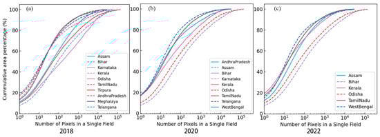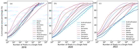 Cumulative distribution of patches with varying pixel numbers in the (a) 2018, (b) 2020, and (c) 2022 summer rice distribution maps.