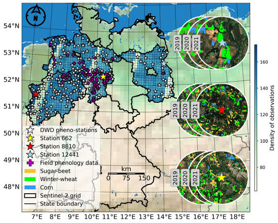 Overview of the study area spanning across three federal states in Germany. White stars indicate DWD phenological stations, and pink plus signs represent the phenological field sites used in this study. The black grid lines show the Sentinel-2 Analysis Ready Data (S2-ARD) acquisitions used in this study, with the background representing the number of observations in 2019 (as shown in the colour bar). Circles illustrate examples of the sampling design of agricultural field samples of three crops (winter wheat, corn, sugar beet) within a 5 km radius around three randomly selected DWD phenological stations for three years (2019, 2020, 2021).