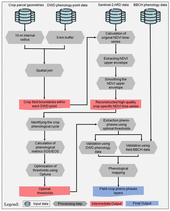 Although many approaches have been proposed to retrospectively capture and map phenological phases, the calibration and optimisation of these phenophases that are specific to certain crop types and re-establishing their definition to be linked with specific agronomic stages of interest have rarely been addressed. This is mostly because it remains challenging to implement an optimised, robust, and unified approach to detect crop-specific phenophases on a regional scale from an optical remote sensing perspective in cloudy and rainy areas. In this context. reducing noise and reconstructing high-quality profiles for further time series analysis is a promising and effective approach to more reliably predict accurate crop phenophases. Using ARD Sentinel-2 time series as the core of this study, we proposed a compound approach based on envelope detection and a smoothing filter to robustly produce high-quality data and identify individual valid vegetation cycles before the phenological retrieval. The results revealed that the new method is effective for reconstructing high-quality data to represent consistent phenological profiles of the different crops studied. Moreover, these high-quality NDVI time series data, along with extensive field information from collected in situ data and DWD phenology observations, were used together to calibrate and optimise the thresholds for extracting crop-specific land surface phenology. Our optimised thresholds provided enhanced capability in accurately estimating phenophases and achieved satisfactory accuracy that links more directly to in situ phenological observations. Moreover, the thresholds were used to predict field phenological information and thus illustrate more detailed spatial and temporal information. This study provides an advanced cloud platform-based phenology study case under different scenarios at landscape levels and provides technical support and application demonstration for field-level research, such as simulations of crop growth models and the analysis of the underlying reason for yield gaps at the field level.