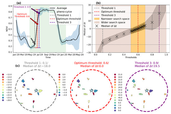 Subsequently, the median values of the temporal difference were calculated from the differences for each field within the station buffers for all investigated years. The median values were used as measures of the accuracy of estimated phenophases. To demonstrate the principle of this optimisation process, we show a graphical representation of it for one DWD station in Figure 3. This procedure is repeated for all DWD stations, and the optimal threshold is returned when the lowest median value is obtained between the DOY derived from the satellite and the observed DOY at all available DWD stations. Furthermore, the optimal threshold is compared between the SOS and the EOS to determine which yields the lower error in terms of . This helps in judging which metric to use for each crop-specific phenophase.