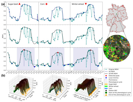 (a) Example temporal profiles of demonstrating the main stages of time series reconstruction using UE-WS for three crop samples at station 662. (b) Additionally, an example of identifying the phenological cycle for all crop parcels in DWD station 662 is illustrated in Figure 1.