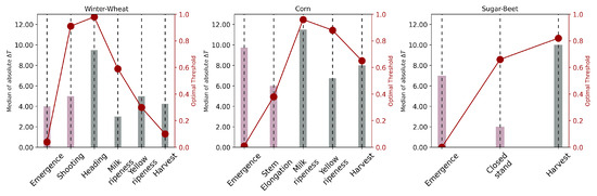 Optimising the threshold in Equation (4) depends on the specific phenophase and the type of crop that is targeted. For example, a lower threshold that effectively identifies the emergence stage in winter wheat might overlook the heading stage of the same crop or could inaccurately detect the emergence phase of another crop. Therefore, it is crucial to calibrate and optimise these thresholds to accurately represent a particular phenological stage. This optimisation process ensures that the thresholds are well-suited to explain the targeted phenophase, such as emergence or heading, for a given crop type.