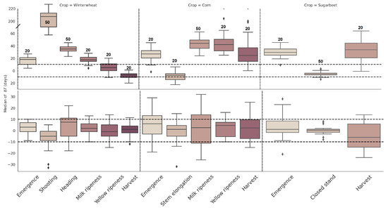 The accuracy of the retrievals of phenophases using the optimal thresholds detected was further assessed against ground observation data from a separate year to assess the plausibility of the thresholds and the proposed approach. Figure 6 shows boxplots of the median of between the phenophases derived from S2 using random thresholds (upper part) and the optimal ones (bottom part) compared to in situ measurements from DWD data in 2021 for the three crops under study. It can be observed that the phenological phases obtained using our proposed method and optimal thresholds correlate well with the phenophases reported by the DWD observations. This is in contrast to the results obtained using random or unoptimized thresholds. The interquartile range of the boxplots for optimum thresholds generally falls within the 10-day error range. Only three phenophases (emergence and milk ripeness of corn and harvest of sugar beet) have boxplots that extend slightly beyond the 10-day lines, yet their medians remain within this error range.
