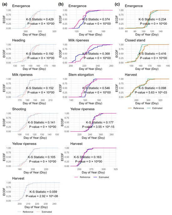 For a more quantitative comparison with visual comparison, we aggregated in situ observations using the minimum bias approach proposed by [55,56], which involves selecting the in situ observation that has the minimum absolute difference from the reported DWD station. This method aims to minimise bias and ensure that the selected observations closely represent the conditions reported by the DWD station, enhancing the reliability of our analysis and visualisations. Moreover, the Empirical Cumulative Distribution Function (ECDF) and Kolmogorov–Smirnov (K-S) test were used to evaluate the accuracy of DOY phenophase estimations by comparing reference DOYs with DOYs predicted with minimum bias. This approach provides a visual and quantitative assessment of the alignment between the two distributions [57]. The ECDFs allow for visual comparison, while the K-S test quantitatively measures the absolute maximum difference, yielding a p-value to indicate if the distributions differ significantly. This combined method not only allows for a detailed comparison but also helps to identify any systematic biases or inconsistencies in the prediction model, ensuring that the estimated DOYs are reliable and comparable to the actual reference DOYs [58].