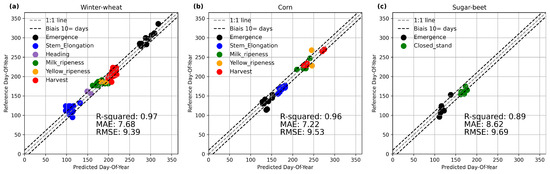 Comparison between field-referenced phenology and satellite-predicted phenological phases for (a) winter wheat (b) corn, and (c) sugar beet. The grey dashed lines represent the 1:1 lines, and the two black dashed lines are the deviation of ±10 days from a perfect prediction.