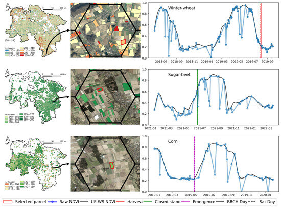 To assess how well our proposed approach performs in generating accurate time series and reliably identifying crop phenological cycles, Figure 4a illustrates both the original and reconstructed time series derived from our suggested methodology for three randomly sampled fields. The three samples were selected to be representative of the crop class studied within the 662 DWD station (cf. Figure 1), namely sugar beet, corn and winter wheat.