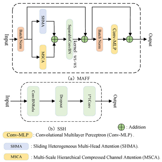 where represents the input to MAFF, represents the output after the Batch Norm layer, represents the output of the first residual, and , , represent the Batch Norm layer, SHMA layer, and MSCA layer, respectively.