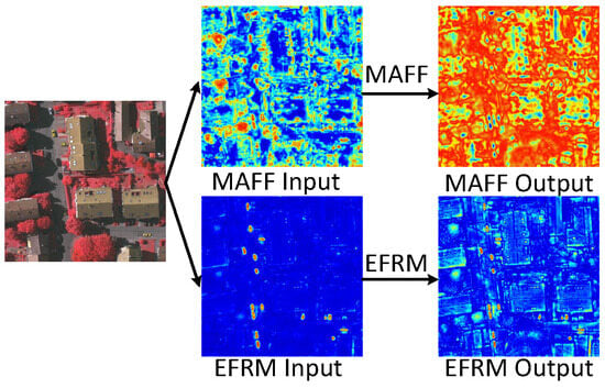 We validate the refinement of rich features by EFRM through the heatmap, as shown in Figure 4. Prior to EFRM processing, the model exhibited a stronger focus on categories like vehicles with fixed shapes. Due to feature redundancy and the high inter-class similarity in remote sensing images, other categories had a more balanced level of attention. After undergoing EFRM processing, the model actively focuses on key information of other categories as well, demonstrating that our designed EFRM can refine rich features and positively impact semantic segmentation tasks.