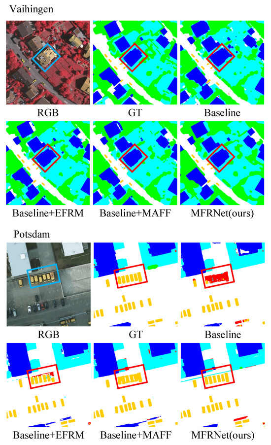 The ablation experiment results are presented in Figure 8. The segmentation results when the components are used individually clearly show that compared to the baseline, the outlines of the buildings are more complete. Furthermore, the model correctly identifies the vehicle categories that were misclassified by the baseline. Moreover, the segmentation results are more accurate when the two components work together.