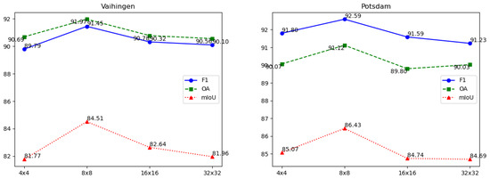 The ablation experiment results on SHMA window sizes on the Vaihingen and Potsdam datasets. Horizontally, window sizes are represented, while vertically, metric values are displayed as percentages.