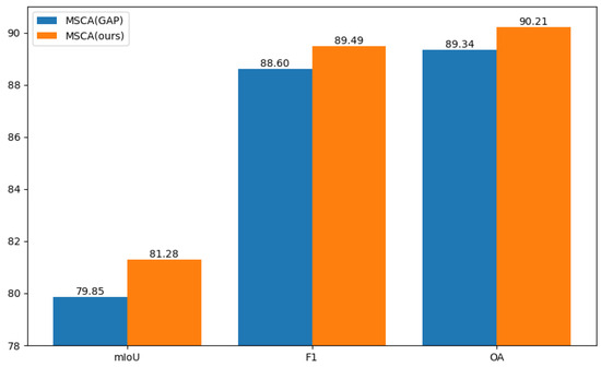 To validate the reliability of our designed MSCA compared to using Global Average Pooling (GAP), we conducted relevant ablation experiments in the Vaihingen dataset, and the results are shown in Figure 10. MSCA outperformed GAP with an increase of 1.43% in mIoU, 0.86% in F1, and 0.87% in OA. By comparing these metrics, it is confirmed that the channel information obtained by MSCA is more reliable.