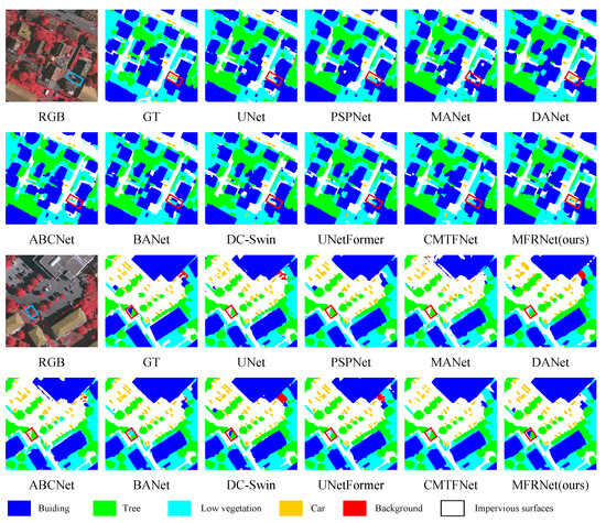 To quantitatively analyze the advantages and disadvantages of our approach in contrast to widely used methods, we conducted comparative experiments on the Vaihingen and Potsdam datasets. The results of these experiments are exhibited in Table 3 and Table 4. On the Vaihingen dataset, MFRNet-R outperformed other models with a 0.96% higher MeanF1, a 1.58% higher mIoU, and a 0.39% higher OA compared to the second-best model, and MFRNet-S outperformed other models with a 1.65% higher MeanF1, a 2.73% higher mIoU, and a 1.06% higher OA compared to the second-best model. These results demonstrate the effectiveness of our designed decoder, which can compensate for the shortcomings of feature extraction in CNN and Transformer models. Furthermore, these results prove that our decoder possesses strong generalization capabilities, capable of handling backbone networks of varying depths.