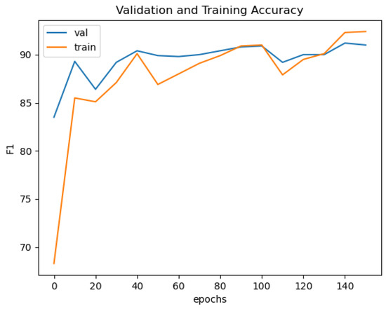 Finally, we present the training and validation accuracy plot of MFRNet on the Vaihingen dataset, as shown in Figure 13. Our model remains stable during the mid and late stages, indicating good generalization ability. The F1 scores of the validation set and the training set are close during these stages, suggesting that the model does not exhibit overfitting and demonstrates effective Ultimately, we attribute the superiority of our model over other network models to the following factors: