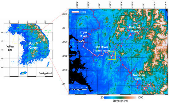 The Han River is one of the major rivers in South Korea, stretching approximately 494 km and covering a watershed area of approximately 26,000 km2 (Figure 1). The Han River originates from the confluence of the two major tributaries, the Namhan River (South Han River) and the Bukhan River (North Han River). It flows westward through the capital city of Seoul and the metropolitan areas of the Gyeonggi Province, eventually emptying into the Yellow Sea after merging with the Imjin River. The width of the Han River varies significantly, ranging from tens of meters in its upper reaches to several kilometers wide in the lower sections. The river’s depth and flow rate are also variable, influenced by seasonal changes and weather conditions, which in turn affect river ice formation. The Han River freezes nearly every winter season, with the annual freezing period varying significantly (50.3 ± 30.6 days, [11]).