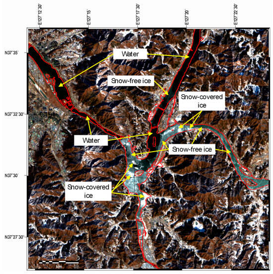 An example of manual extraction of samples for snow-covered ice, snow-free ice, and water-based on visual investigation of the Landsat-8 RGB true color composite image at the path/row 116/34, obtained on 1 January 2018. The image area corresponds to the yellow box on the right image in Figure 1, and the red lines indicate the water boundary.