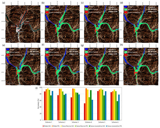 For the case of 24 February 2017 (Figure 5a), when WV content was high and AOD was low, the river ice mapping models developed based on all variable selection schemes showed good performance in detecting water and snow-free river ice (Figure 5c–h), with overall accuracy and kappa coefficient higher than 89% and 0.77, respectively, when compared to the reference river ice map (Figure 5b). However, the river ice mapping models, except for schemes 5 and 6, misclassified some pixels of snow-free ice as water, especially in Area A indicated in Figure 5a. Additionally, the models developed for schemes 1–4 and 6 did not detect snow-covered ice well (Area B), although there was little snow-covered ice in the test region. In contrast, the model for scheme 5 showed high performance in detecting snow-covered ice as well (Figure 5g), and achieving the greatest overall accuracy (94.1%) and kappa coefficient (0.88) (Figure 5i).