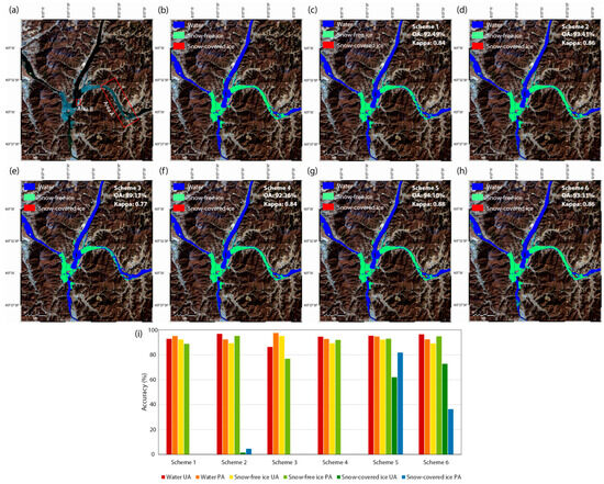 (a) Landsat-8 OLI RGB true-color composite image on 24 February 2017 (low AOD conditions, high WV content) and the corresponding river ice map generated by (b) manual interpretation and (c–h) the RF models based on variable selection schemes 1 to 6 around the Paldang Lake. (i) Accuracy assessment metrics of the RF model-derived river ice maps calculated based on (b).