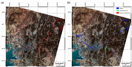 (a) Landsat-8 OLI RGB true-color composite image on 15 February 2017 and (b) the corresponding river ice map generated by the RF model based on variable selection scheme 5. The red polygons in (a) represent the streams of the Han River.