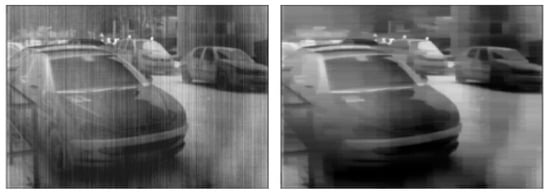 3. Stripe noise removal methods based on a neural network. The proposal of the neural network method utilized the mechanism of the human retina in capturing image information, and corrected each pixel according to the information in the field of view. In 2019, Guan et al. proposed an innovative wavelet deep neural network [], which accurately estimated the noise according to the inherent features of stripe noise and the complementary information between different wavelet sub-band coefficients, and separated stripe noise and scene details more thoroughly through a special directional regularizer. In 2023, Huang et al. proposed a dual-denoising-driven convolutional neural network [], which introduced two auxiliary variables corresponding to the denoised image and stripe noise, respectively, and used the U-shaped network for the denoising auxiliary variable and the residual CNN for the stripe auxiliary variable. The neural network-based method does not have much requirement for noise characteristics in terms of noise removal, but we need to focus on the “artifacts” problem of moving objects caused by the excessive iteration of these methods.