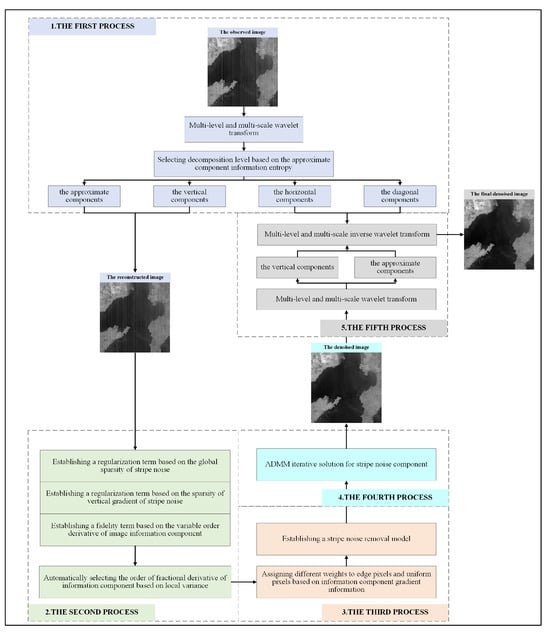The algorithm proposed in this paper mainly includes five processes: In the first process, the wavelet transform is used to decompose the infrared remote sensing image containing stripe noise at multiple levels and scales, and stripe noise is concentrated in the approximate and vertical components of different levels. These two components are used to reconstruct the image through inverse wavelet transform, where the horizontal and diagonal components are set to zero, and the wavelet decomposition level is selected according to the information entropy of the approximate components. In the second process, a stripe noise removal model with fractional order adaptive selection according to local variance is established for the reconstructed noise image. In the third process, on the basis of the gradient values of the image information component, different weights are assigned to the edge and texture pixels. In the fourth process, the ADMM algorithm is utilized to solve this model to obtain the image containing clean multi-level vertical components and approximate components. In the fifth process, the multi-level vertical components and approximate components without stripe noise obtained in the fourth step and the horizontal and diagonal components obtained in the first step are reconstructed to obtain the clean image information component. Figure 2 shows the concrete flow of the algorithm.