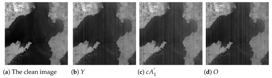 As shown in Figure 7c, in the infrared remote sensing image, stripe noise presents a column structure and accounts for a relatively small proportion of the image, which can be considered as a sparse matrix. L0 norm is most suitable for describing sparsity but, because of its non-convexity and difficult solvability [,], this paper uses L1 norm to constrain the global sparsity of stripe noise. L1 norm is a convex function that can be used as an approximation of L0 norm. From this, the regularization term is established as follows: