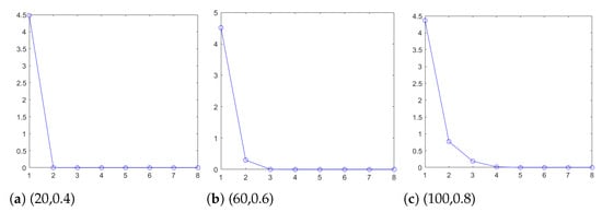 In this paper, a method of selecting wavelet decomposition level based on the approximate component information entropy is proposed. Information entropy is an index that can measure image complexity and uncertainty []. Generally, the higher the information entropy, the higher the complexity of the image, and the more information it contains, so a larger decomposition level is needed to capture this information. In order to select the optimal decomposition level, non-periodic stripe noise with noise ratio and intensity of 0.4 (−20∼20), 0.6 (−60∼60), and 0.8 (−100∼100) is added to Figure 5a, and the fixed wavelet basis function is used to perform multi-level and multi-scale decomposition on the image after adding noise, the information entropy of the decomposed approximate components is calculated, and the change in information entropy is observed with the increase in wavelet decomposition level. The graph is shown below, with the abscissa representing the decomposition level and the ordinate representing the information entropy of the approximate components: